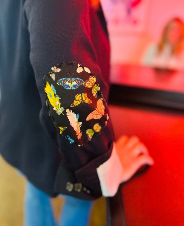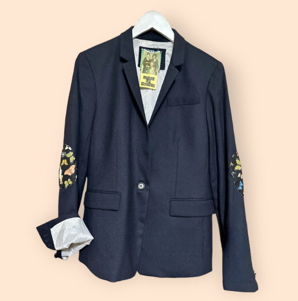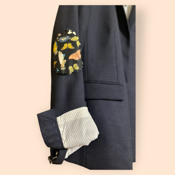 Navy and Black together? Okay, hear me out… it is one of the most sophisticated color combinations, in my opinion. Even in a tailored item that can be worn casually, the pairing is an immediate level-up. This is a classic piece that should be in every closet… a polished layering piece with flavor. It can be worn with a great black trouser or jean, some distressed ex-boyfriend jeans, a middi tulle skirt, or whatever you dream up. This jacket was a labor of love as the patches were made with scraps from another project then hand-stitched onto the elbows. Don’t take blazers too seriously, have some fun!