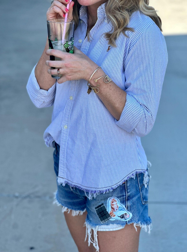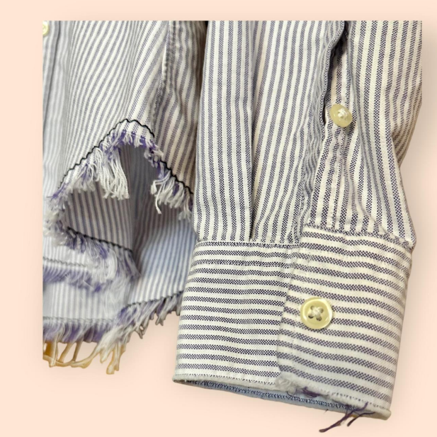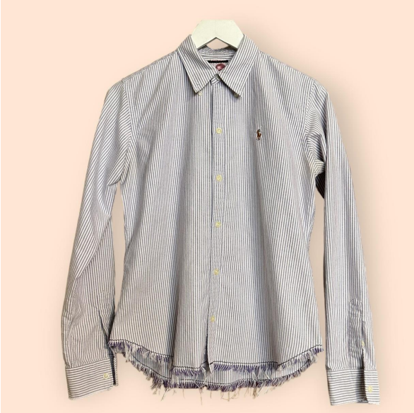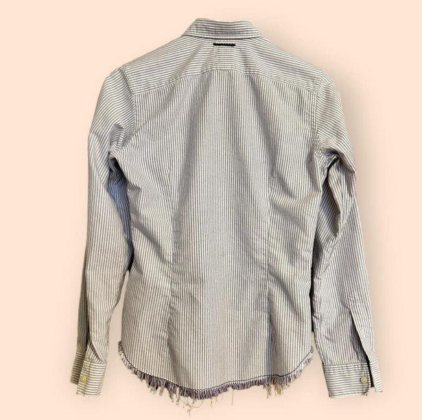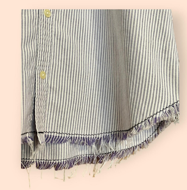 This Ralph Lauren shirt has been resurrected by cutting a persistent spot off the bottom and then adding a decorative topstitch there. I added the topstitch in black so that it can be worn in a more edgy way than its lavender color might be initially thought to allow. I believe a classic Oxford shirt can lend itself to a variety of looks if you don’t take them so seriously. This shirt measures 19.75” across the chest, 25” in length, and 20” sleeves.