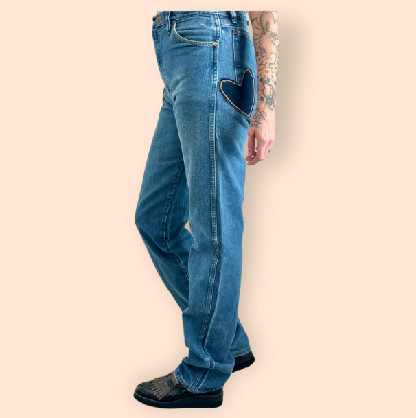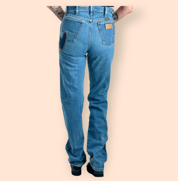 We found these jeans on a really fun shopping trip. We were not looking for jeans but randomly found these Wranglers, so we took them home with us and LUVed them up. I made patches using flannels and another pair of salvaged jeans. They are SUPER long for the tall gals, but with the straight leg cut, they would also work perfectly cuffed or hemmed.