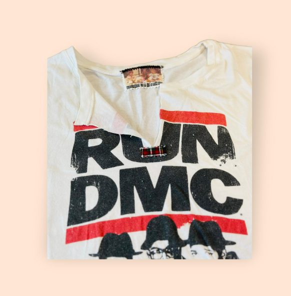Because “it’s tricky to rock a rhyme”, I had to help this one get back out there. This tee has been resurrected by releasing previously cuffed sleeves (one was ripped), then venting the neckline using a scrap of flannel to anchor and mending bottom seam.