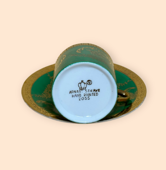 This espresso cup and saucer made in Japan, are in great vintage condition with no chips or cracks - even the gold is near perfect. Produced sometime after 1957, as that is when Arnart registered the “5th Ave” mark. Cup is about 2.2” tall, saucer 4.25” diameter.