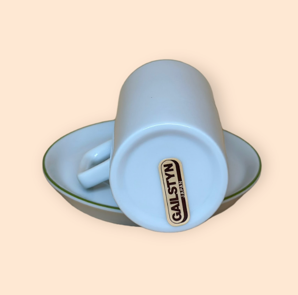 Well, this little set is a ray of sunshine that could be used in many ways, as all sweet lil demitasse sets can. In Spring she’ll bring a smile and in winter months she’ll remind you of the thaw that will come. Cup approx. 4 1/4" tall with 2" diameter with saucer 4 1/2" in diameter.