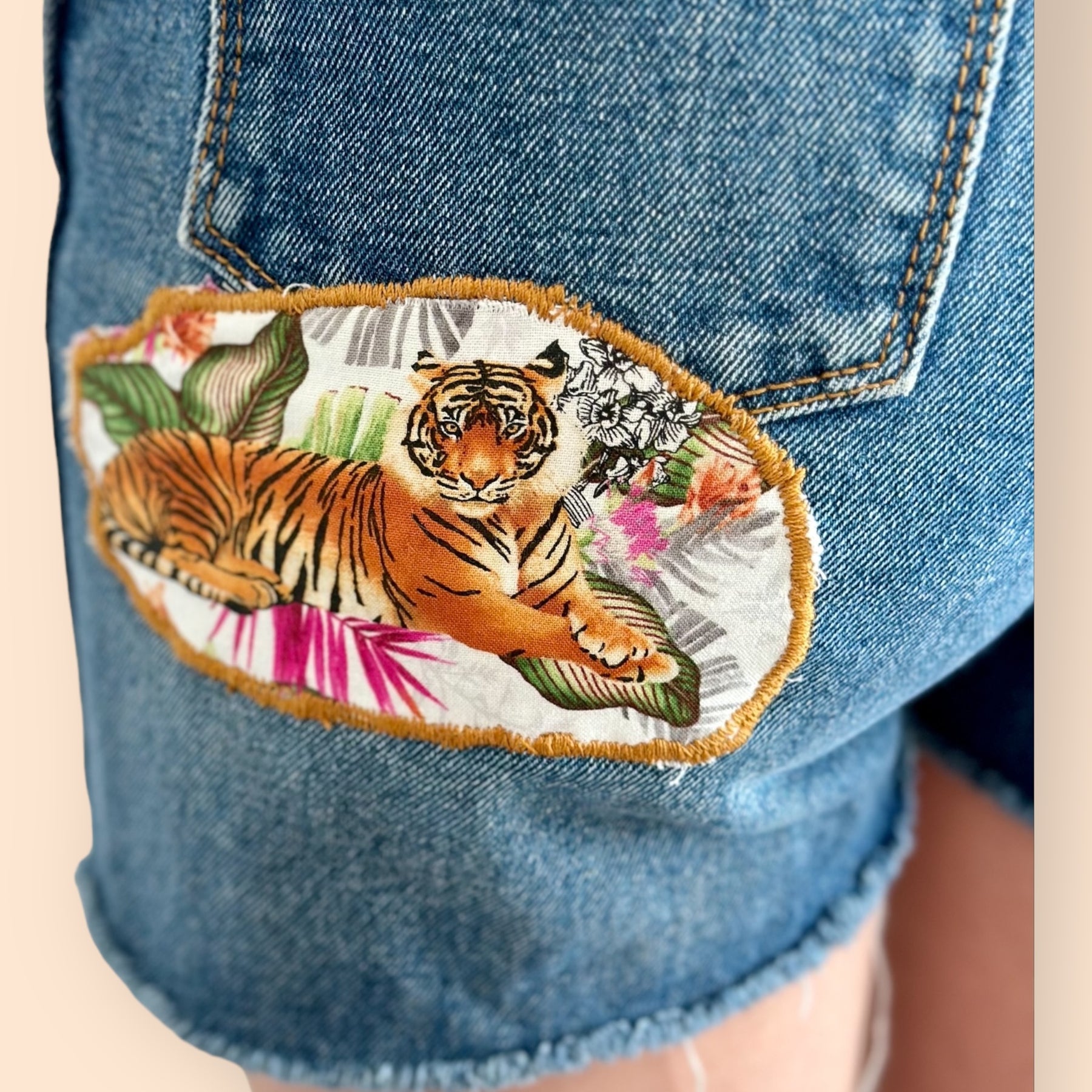 Two of my favorite summertime staples... 1970's brands and cutoff denim shorts. This was another great jean I found that had to be cut off. There was an unfortunate stain on one of the legs, so I cut at a length that allows for a cuff if you prefer. I then distressed the front and added a patch of vintage fabric from another project on the back. Rawrrrrr!