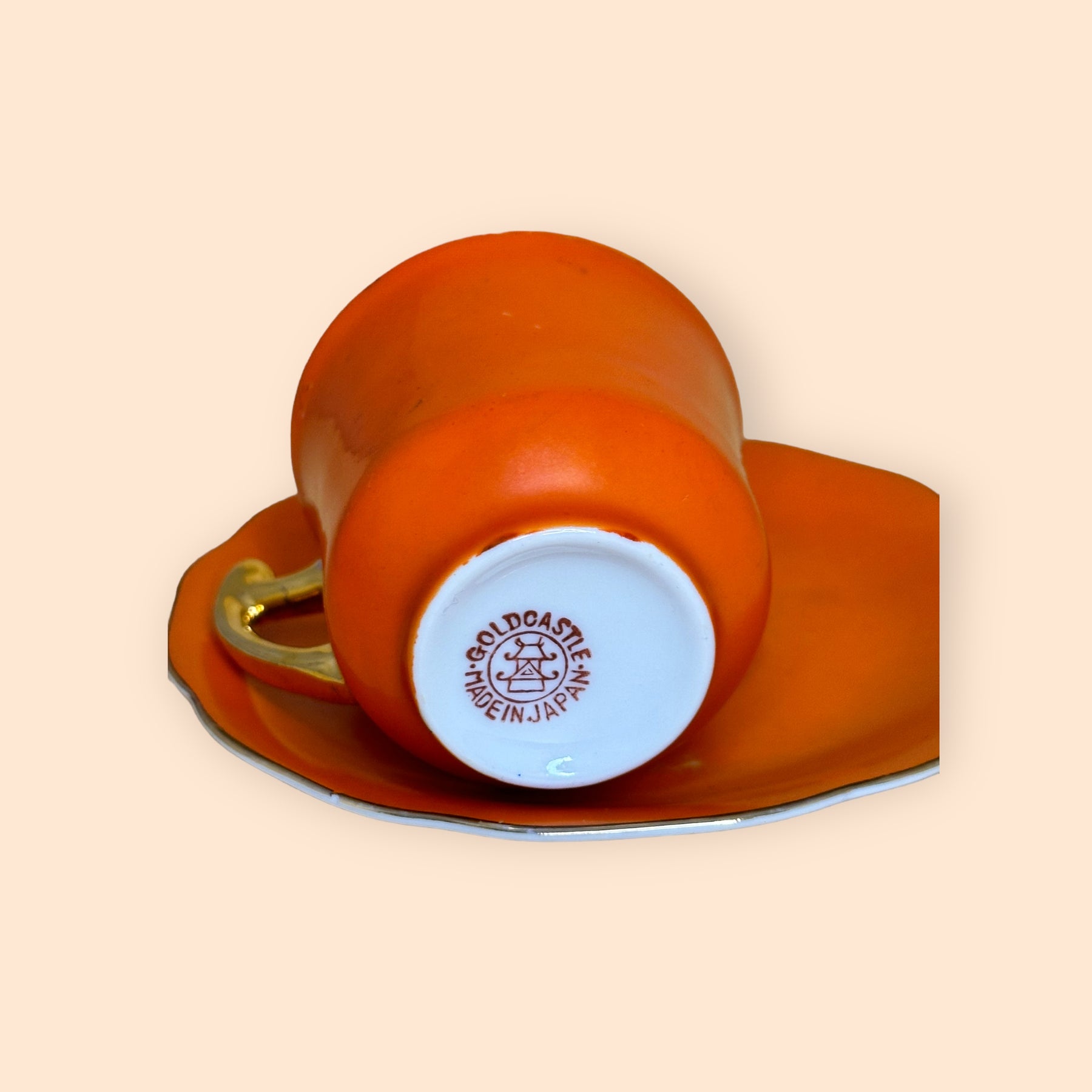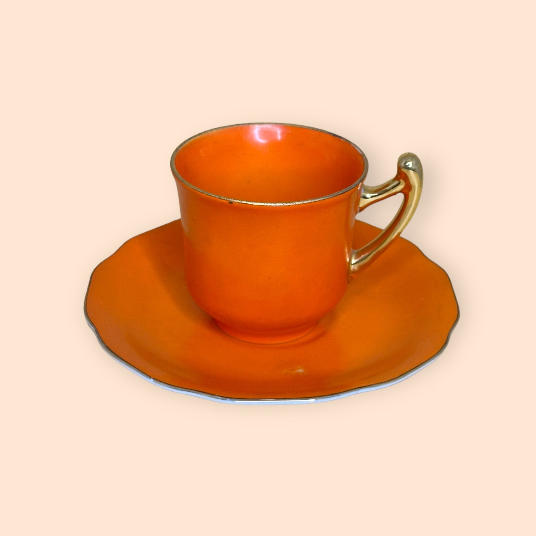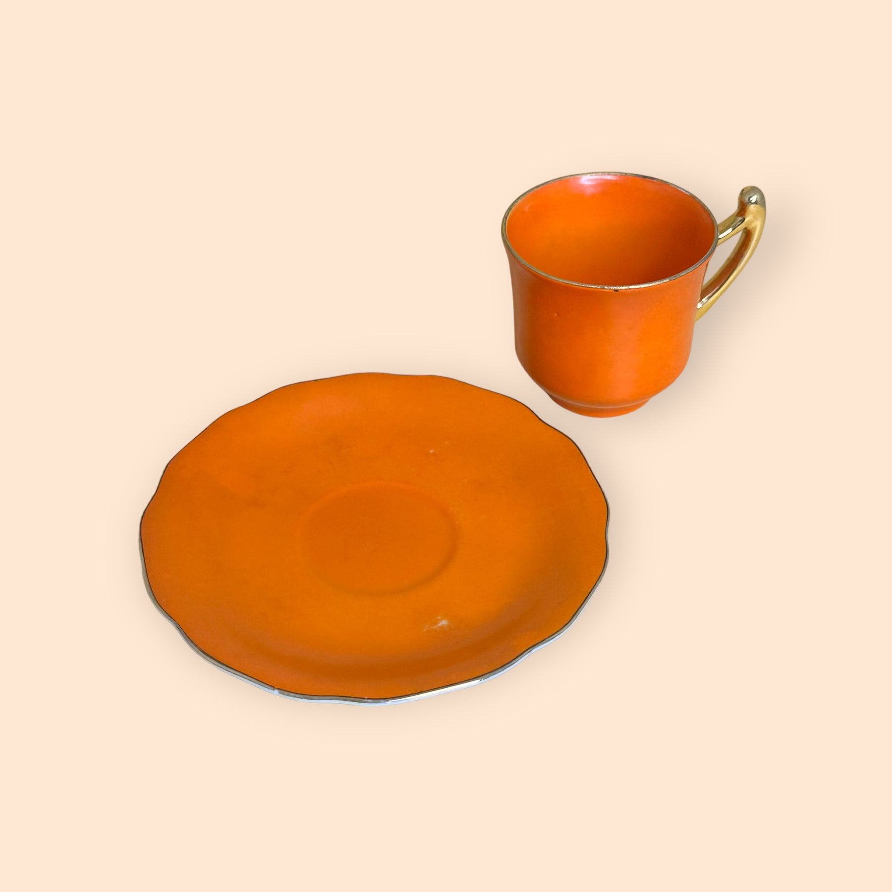 This Mid Century Modern espresso cup and saucer made in Japan, are in lovingly used condition. Although the set was likely made in the 1940's this vibrant orange color brings allllllll the 1970's Maw Maws house energy and we are living for it. We usually look for pieces in great condition, but there are times that an item just speaks to us... this was one of those times. Could you find a set in better shape, probably, but it wouldn't be this set and if you feel energy you want this one. Cup is about 2.25” tall, saucer 4.75” diameter.